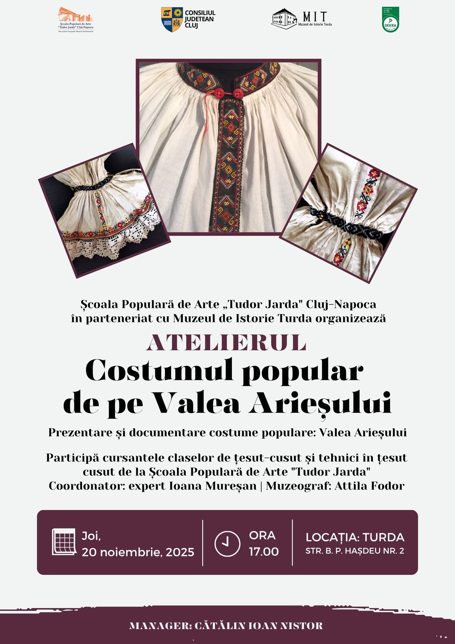 Școala Populară de Arte „Tudor Jarda” Cluj-Napoca organizează, în parteneriat cu Muzeul de Istorie Turda, atelierul „Costumul popular de pe Valea Arieșului”, un eveniment educațional și de cercetare etnografică destinat cursantelor claselor de Țesut-Cusut și Tehnici în Țesut-Cusut. Atelierul va avea loc joi, 20 noiembrie, de la ora 17:00, la sediul Muzeului de Istorie Turda, situat pe strada B. P. Hașdeu nr. 2, municipiul Turda. Activitatea se va desfășura sub coordonarea expertei Ioana Mureșan, iar componenta de documentare muzeală va fi realizată cu sprijinul muzeografului Attila Fodor. Participantele vor avea…