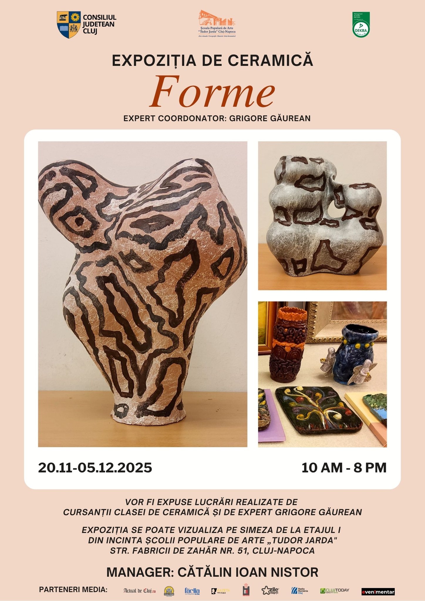 Școala Populară de Arte „Tudor Jarda” din Cluj-Napoca invită publicul să descopere expoziția de ceramică „Forme”, deschisă între 20 noiembrie și 5 decembrie 2025. Timp de peste două săptămâni, o parte din spațiul expozițional de la etajul I al școlii va găzdui un univers al volumelor, texturilor și expresivității în lut, reunind lucrări create de cursanții clasei de ceramică, alături de propriile creații ale coordonatorului lor, expertul Grigore Găurean. Expoziția poate fi vizitată zilnic, în intervalul 10:00–20:00. Evenimentul se desfășoară în cadrul programului „Joia Școlii de Arte”, dedicat promovării creativității…