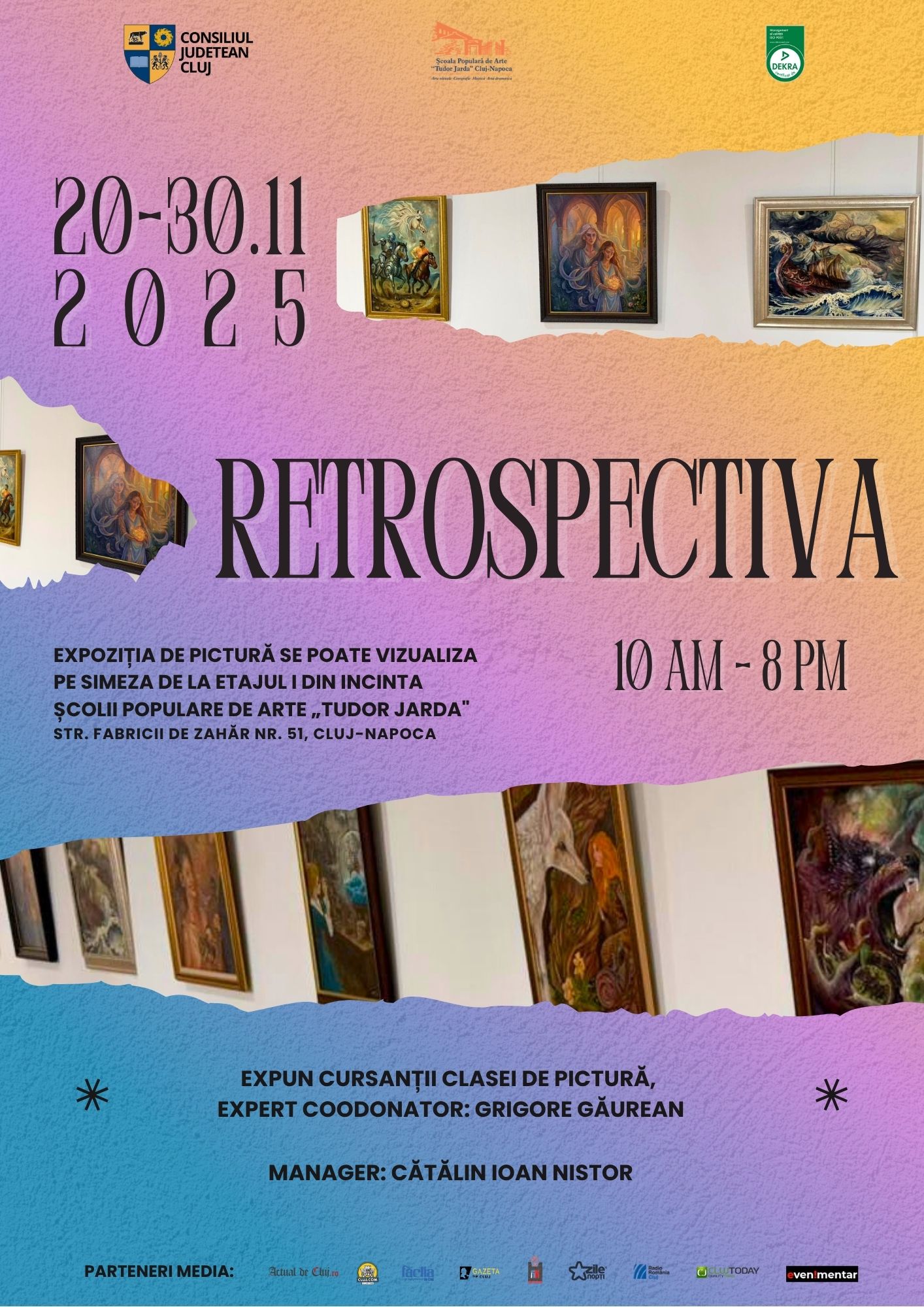 Expoziția de pictură „Retrospectiva” va fi deschisă publicului între 20 și 30 noiembrie 2025 la Școala Populară de Arte „Tudor Jarda” din Cluj-Napoca. Astfel, pe durata celor zece zile de expoziție, galeria de la etajul I al școlii se transformă într-o frumoasă călătorie dedicată creațiilor realizate de cursanți în ultimii ani, lucrări formate sub coordonarea expertului Grigore Găurean. Vizitatorii pot admira expoziția zilnic, în intervalul orar 10:00 – 20:00. Evenimentul face parte din programul „Joia Școlii de Arte”, menit să promoveze arta și să susțină evoluția cursanților aflați în proces…