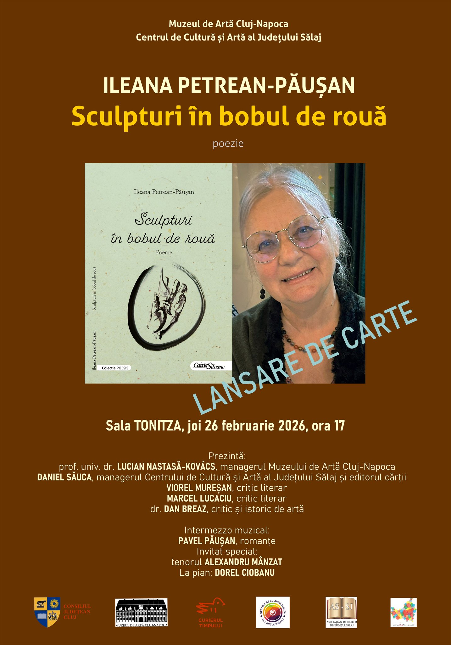 Muzeul de Artă Cluj-Napoca, în colaborare cu Centrul de Cultură și Artă al Județului Sălaj, cu sprijinul Asociației Scriitorilor din Județul Sălaj și al Asociației „Curierul Timpului” organizează, joi, 26 februarie 2026, lansarea cărții de poeme intitulată Sculpturi în bobul de rouă (Editura „Caiete Silvane”, 2025), semnată de Ileana Petrean-Păușan. În deschiderea evenimentului din data de 26 februarie 2026, de la ora 17:00, vor lua cuvântul prof. univ. dr. Lucian Nastasă-Kovács, managerul Muzeului de Artă Cluj-Napoca; Daniel Săuca, managerul Centrului de Cultură și Artă al Județului Sălaj și editorul cărții;…