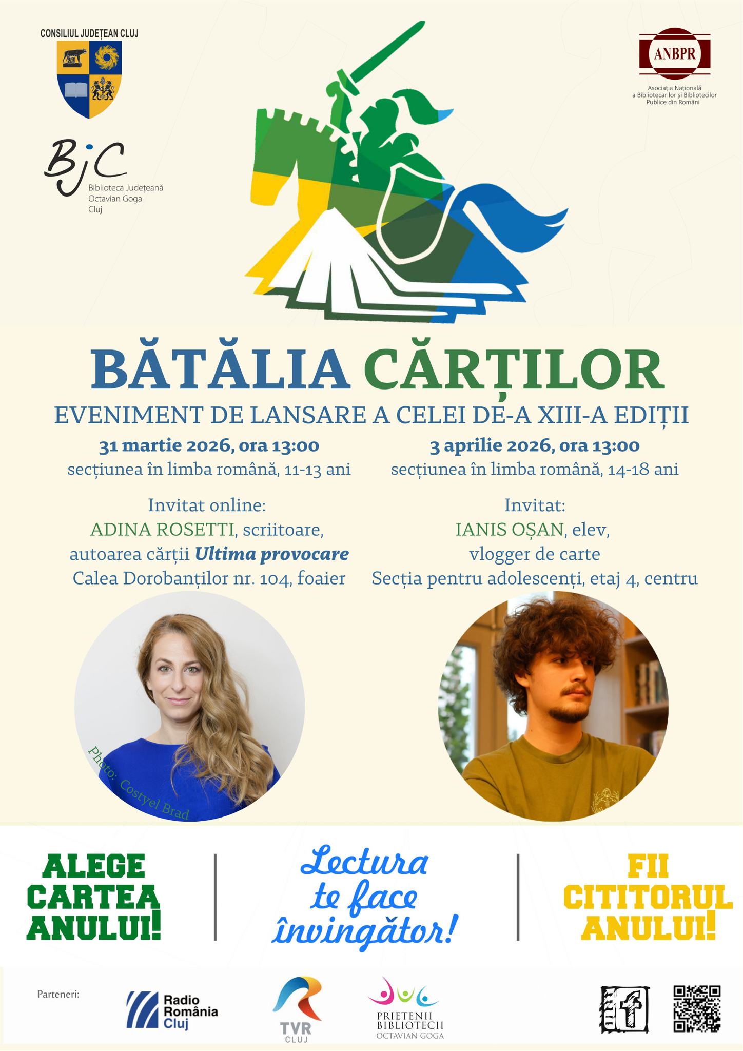 Biblioteca Judeţeană „Octavian Goga” Cluj lansează cea de-a XIII-a ediţie a Concursului Naţional de Lectură „Bătălia Cărților”, care are ca scop cultivarea gustului pentru lectură, dezvoltarea gândirii creative și critice și realizarea de conexiuni între iubitorii de carte. Concursul se va derula în perioada martie – septembrie 2026, sub egida Asociației Naţionale a Bibliotecarilor şi Bibliotecilor Publice din România (ANBPR) și va fi organizat în mai multe biblioteci publice din ţară, dar și din Chișinău, Republica Moldova. Ediția cu sloganul „Lectura te face învingător” este organizat pentru două categorii de…