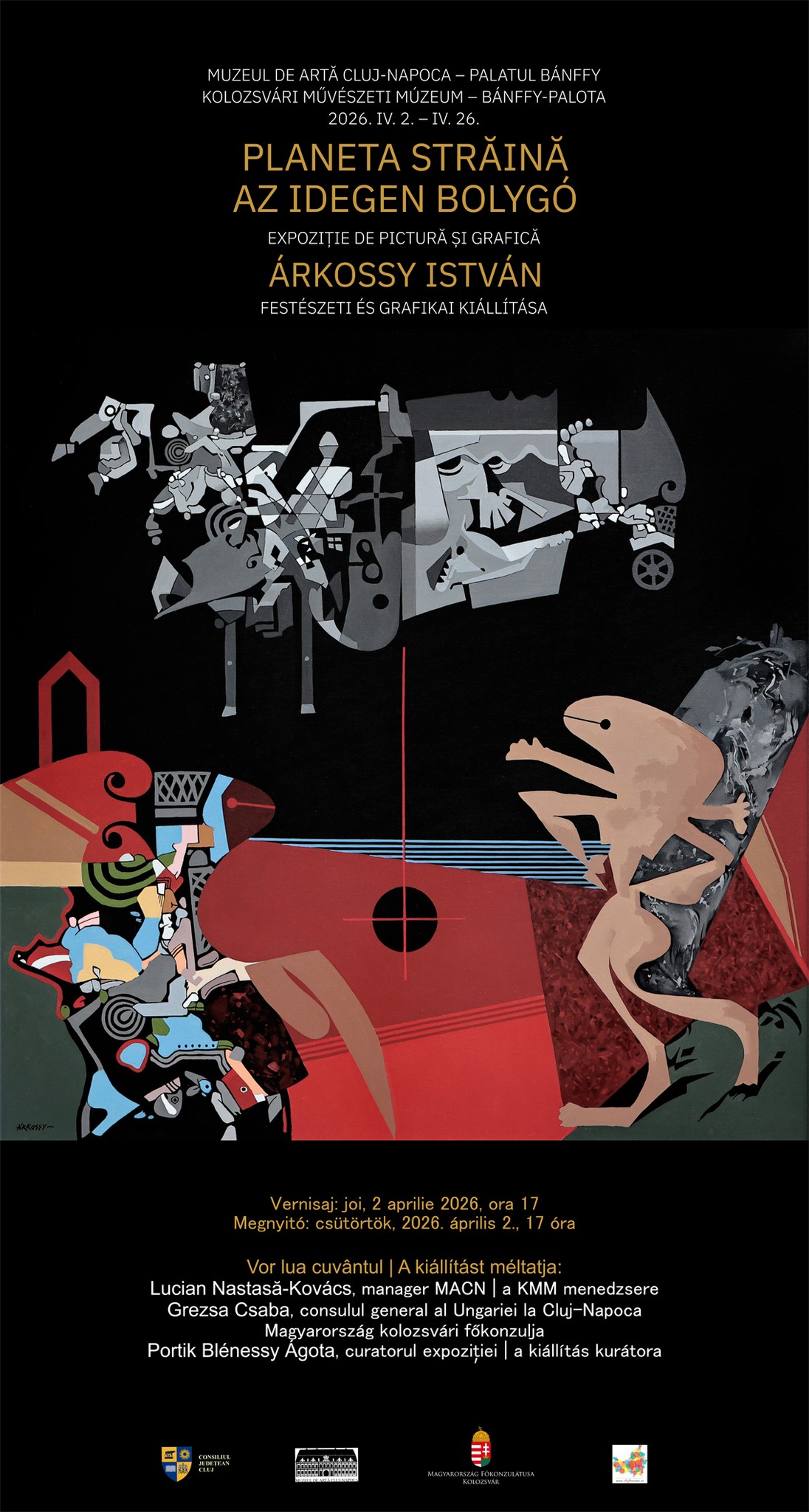 Expoziția de pictură și grafică a artistului Árkossy István, intitulată „Planeta străină” va fi găzduită, la Muzeul de Artă Cluj-Napoca, în perioada 02 – 26 aprilie 2026. Vernisajul va avea loc joi, 2 aprilie 2026, de la ora 17:00,, în Sălile Festive de la etajul Palatului Bánffy. Vor lua cuvântul consulul general al Ungariei la Cluj-Napoca, Grezsa Csaba, managerul Muzeului de Artă Cluj-Napoca, Lucian Nastasă-Kovács și curatorul expoziției, Portik Blénessy Ágota. „Expoziția lui Árkossy István, intitulată „Planeta străină”, constituie amprenta vizuală a căutării familiarității într-o lume percepută în esența ei…