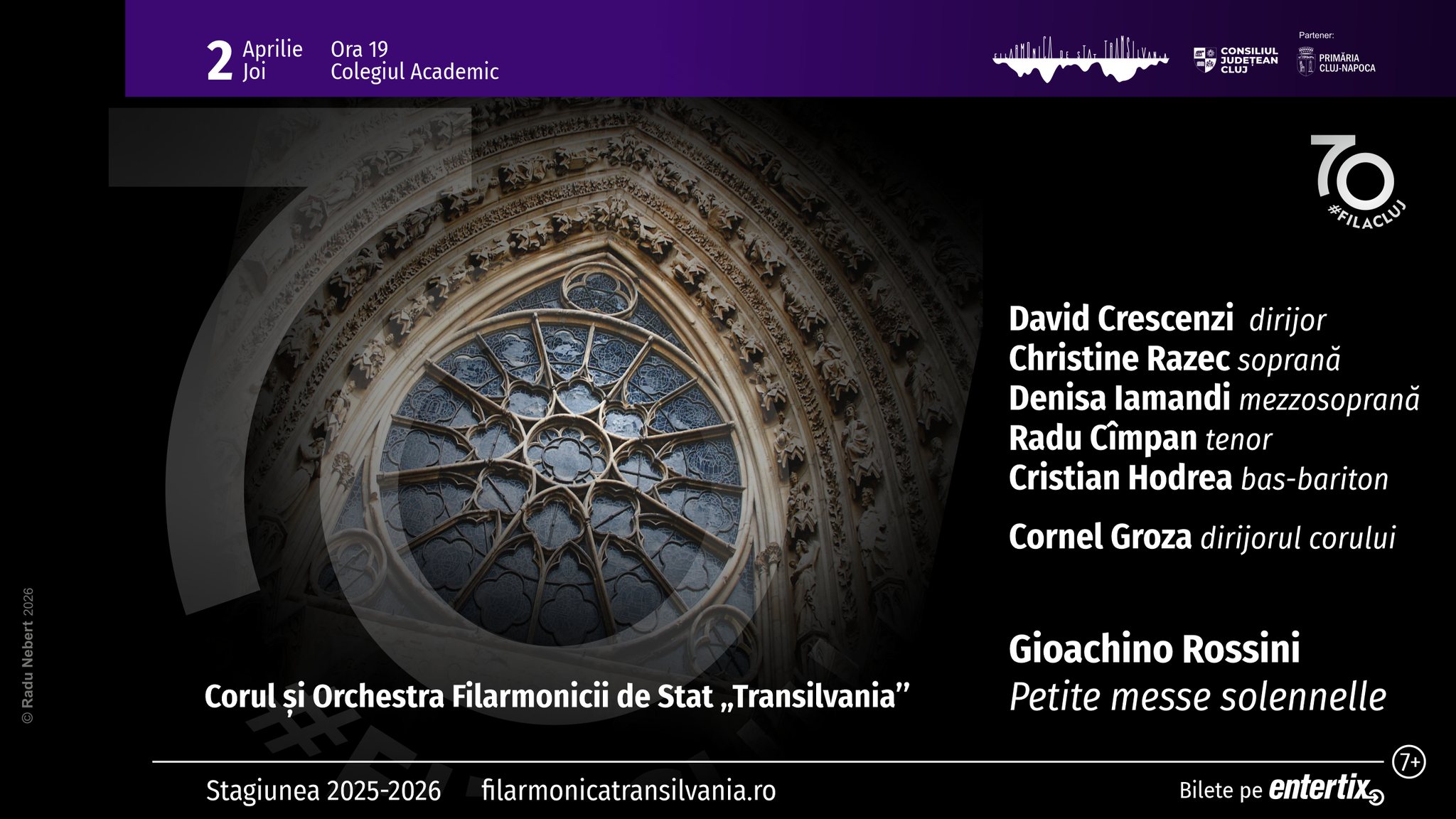Publicul iubitor de muzică este așteptat joi, 2 aprilie, de la ora 19:00, pentru a întâmpina sărbătoarea Paștelui catolic și reformat cu „Petite messe solennelle de Gioachino Rossini”, alături de Christine Razec (soprană), Denisa Iamandi (mezzosoprană), Radu Cîmpan (tenor) și Cristian Hodrea (bas-bariton), precum și de Corul și Orchestra Filarmonicii de Stat „Transilvania” sub bagheta dirijorului David Crescenzi, dirijorul corului fiind Maestrul Cornel Groza. În anul 1829, după ce a compus cea de-a treizeci și noua sa operă, Wilhelm Tell, Gioachino Rossini, aflat în plină maturitate creatoare și în culmea…