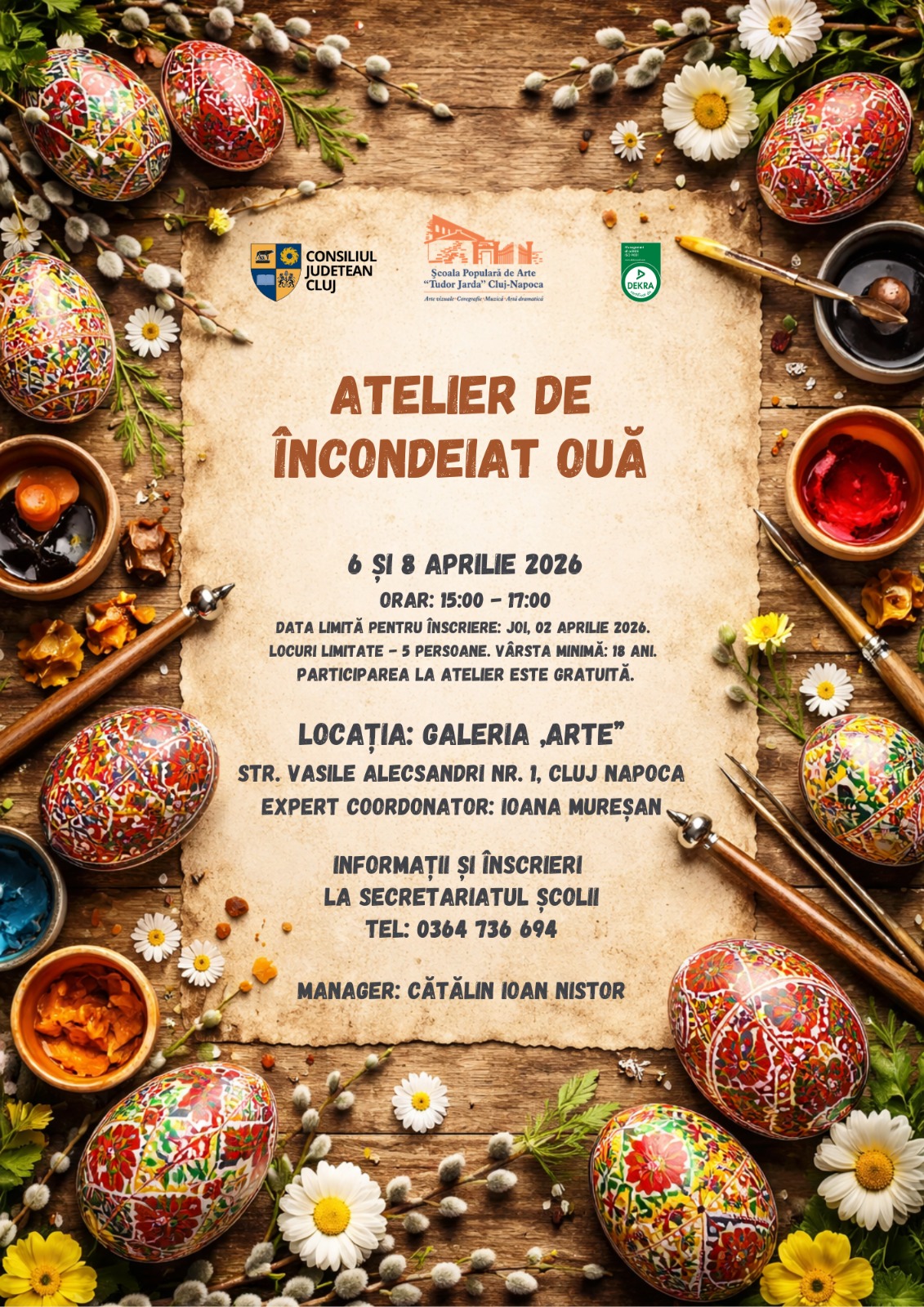 Școala Populară de Arte „Tudor Jarda” Cluj-Napoca organizează un atelier de încondeiat ouă în zilele de 6 și 8 aprilie 2026. Evenimentul va avea loc la Galeria „Arte” a Școlii Populare de Arte „Tudor Jarda”, situată pe str. Vasile Alecsandri, nr. 1, Cluj-Napoca și se va desfășura în intervalul orar 15:00-17:00. Atelierul este destinat persoanelor cu vârsta peste 18 ani și va fi coordonat de Ioana Mureșan, expert al școlii, care îi va ghida pe participanți în tainele tehnicilor tradiționale și contemporane de încondeiat ouă de Paște. Pentru a asigura…
