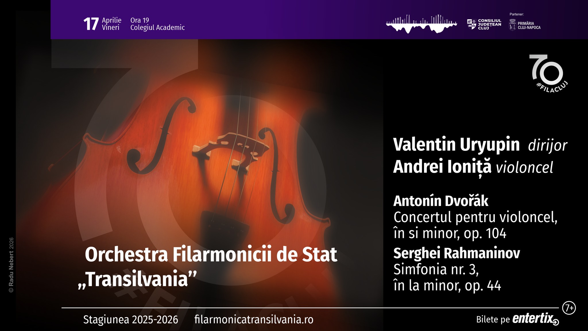 Vineri, 17 aprilie 2026, începând cu ora 19:00, publicul meloman este invitat în sala de concert a Colegiului Academic, pentru a participa la un eveniment muzical de excepție alături de Orchestra Filarmonicii de Stat „Transilvania” sub bagheta dirijorului Valentin Uryupin. Solistul serii va fi violoncelistul Andrei Ioniță, singurul instrumentist român câștigător al medaliei de aur în cadrul celebrului Concurs Internațional P. I. Ceaikovski, numit de către prestigiosul Times of London „unul dintre cei mai incitanți violonceliști care au apărut în ultimul deceniu”. Programul serii va cuprinde: – Concertul pentru violoncel,…