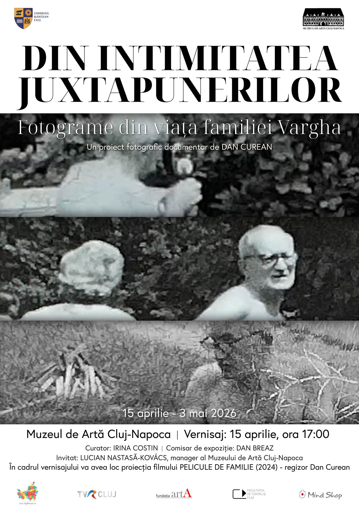 Muzeul de Artă Cluj-Napoca organizează, în perioada 15 aprilie – 3 mai 2026, expoziția „Din intimitatea juxtapunerilor”, care prezintă un proiect fotografic documentar realizat de Dan Curean. Vernisajul expoziției va avea loc miercuri, 15 aprilie 2026, de la ora 17:00 și va include proiecția, de la ora 18:00, a filmului „Pelicule de Familie” (2024, regia Dan Curean, 86 min). Cu ocazia deschiderii oficiale, vor lua cuvântul prof. univ. dr. Lucian Nastasă-Kovács, managerul Muzeului de Artă Cluj-Napoca, Dan Curean și dr. Dan Breaz, în calitate de comisar de expoziție din partea…