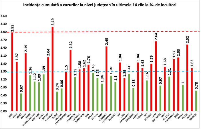 Coeficientul infectărilor cumulate la 14 zile, raportate la 1.000 de locuitori, calculat de către Direcțiile de Sănătate Publică, la nivelul județului Cluj este 2,32.