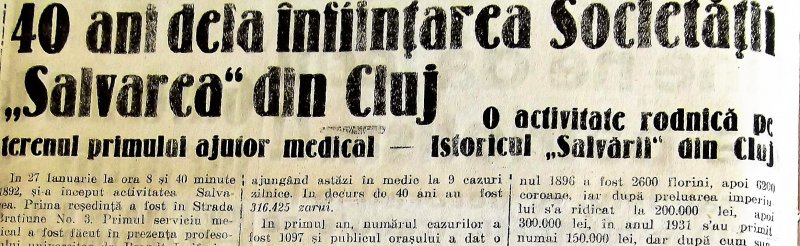 În anul 1932, Societatea „Salvarea” împlinea 40 de ani de funcţionare în oraşul Cluj. Material apărut în acest an, 1932, încearcă să urmărească principalele momente din viaţa acestui serviciu medical în primele patru decenii de funcţionare.