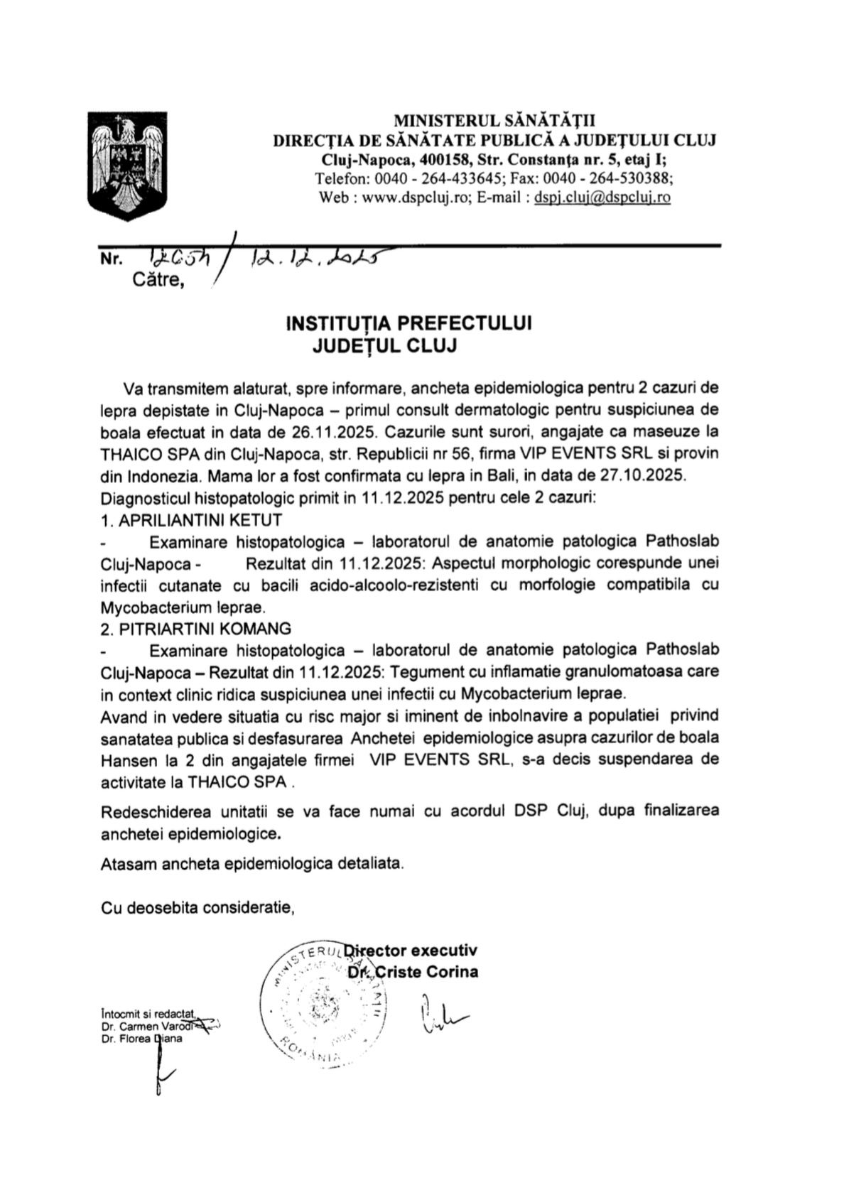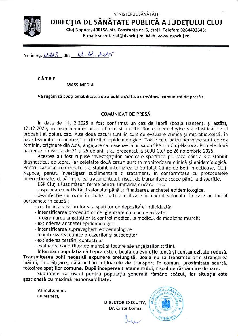 Autoritățile sanitare au confirmat un al doilea caz de lepră la Cluj. Și cea de-a doua pacientă provine din Indonezia. Ea muncea împreună cu prima pacientă în același salon de masaj, Thaico Spa, de pe strada Republicii 56, din Cluj-Napoca. Mai mult, cele două femei locuiesc împreună. Prima pacientă s-ar fi îmbolnăvit de lepră în Indonezia, unde mama sa a fost diagnosticată cu această boală în data de 27 octombrie 2025. Culmea este că salonul cu angajate leproase se laudă pe rețelele de socializare cu un premiu de tip ”luxury”.
