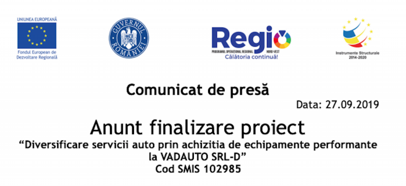 Vadauto SRL, in calitate de beneficiar in cadrul contractului de finantare nr. 984/07.12.2017 incheiat cu Ministerul Dezvoltarii Regionale si Administratiei Publice in calitate de Autoritate de Management pentru Programul Operational Regional 2014-2020 si cu Organismul Intemediar Agentia de Dezvoltare Regionala Nord-Vest, a implementat proiectul “Diversificare servicii auto prin achizitia de echipamente performante la VADAUTO SRL-D”, proiect cofinantat prin Programul Operational Regional 2014-2020, Axa Prioritara 2 – Imbunatatirea Competitivitatii Intreprinderilor Mici si Mijlocii, Prioritatea de Investitii 2.1 – Promovarea spiritului antreprenorial, in special prin facilitarea exploatarii economice a idelilor noi si prin incurajarea crearii de noi intreprinderi, inclusiv prin incubatoare de afaceri.