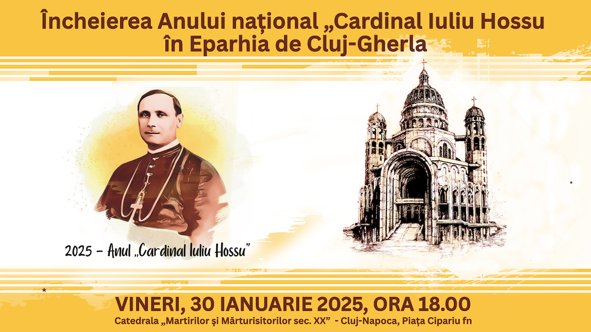Eparhia Greco-Catolică de Cluj-Gherla va marca încheierea Anului Național „Cardinal Iuliu Hossu” prin celebrarea unei sfinte liturghii arhierești de mulțumire, vineri, 30 ianuarie 2025, de la ora 18.00, în Catedrala „Martirilor și Mărturisitorilor secolului al XX-lea” din Cluj-Napoca. Sfânta liturghie va fi celebrată de Preafericirea Sa Claudiu Lucian Pop, Arhiepiscop Major al Bisericii Române Unite cu Roma, Greco-Catolică, și administrator apostolic al Eparhiei de Cluj-Gherla, ca act de recunoștință pentru harurile primite de Biserică și de comunitatea eparhială pe parcursul anului 2025 – un an marcat de numeroase evenimente, inițiative și momente de reflecție…