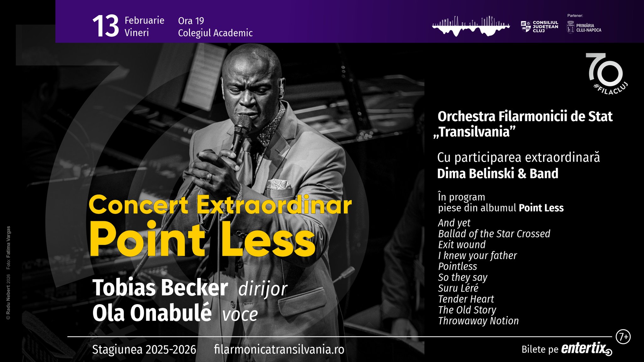Filarmonica clujeană va găzdui un concert extraordinar susținut de Ola Onabulé, artist britanico-nigerian, care va aduce pe scena sălii Auditorium Maximum o serie de piese de pe albumul său solo – Point Less – alături de Orchestra Filarmonicii de Stat „Transilvania”, sub bagheta dirijorului Tobias Becker. Evenimentul va avea loc vineri, 13 februarie 2026, începând cu ora 19:00, la Colegiul Academic. Melomanii clujeni se vor putea bucura de jazz, soul, funk, muzică africană, pop, un mix special creat de jazz-istul britanic.