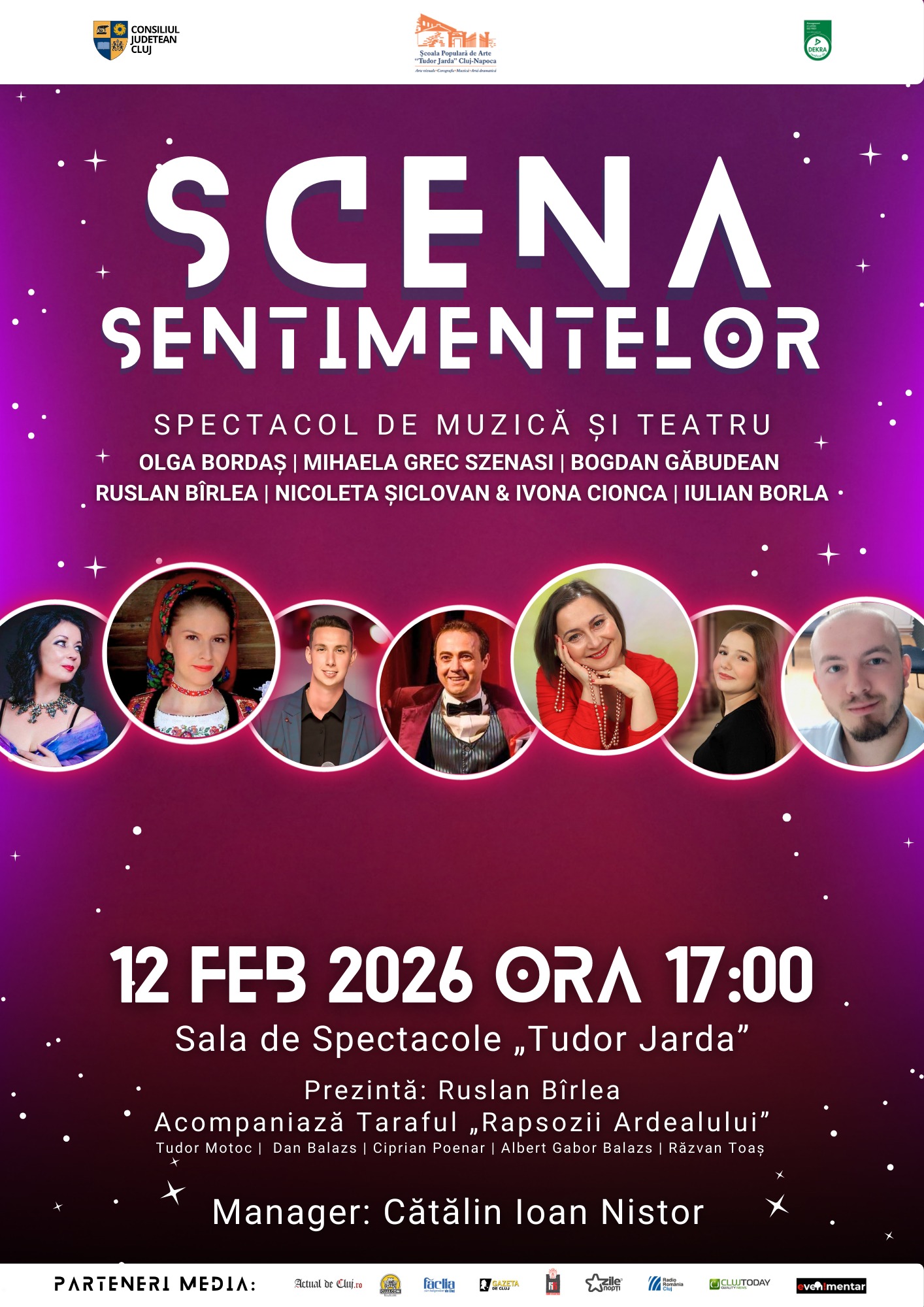 Școala Populară de Arte „Tudor Jarda” din Cluj-Napoca organizează spectacolul „Scena sentimentelor”, un eveniment artistic ce reunește muzica ușoară, muzica clasică, muzica populară și teatrul, într-o seară dedicată emoției și expresiei artistice. Spectacolul va avea loc joi, 12 februarie 2026, de la ora 17:00, în Sala de spectacole „Tudor Jarda”, și va fi prezentat de Ruslan Bîrlea. Conceput în contextul lunii iubirii, „Scena sentimentelor” propune o abordare echilibrată și rafinată a temei sentimentelor și a dragostei. Emoțiile sunt explorate subtil, prin muzică și teatru, de la bucurie și speranță, la…