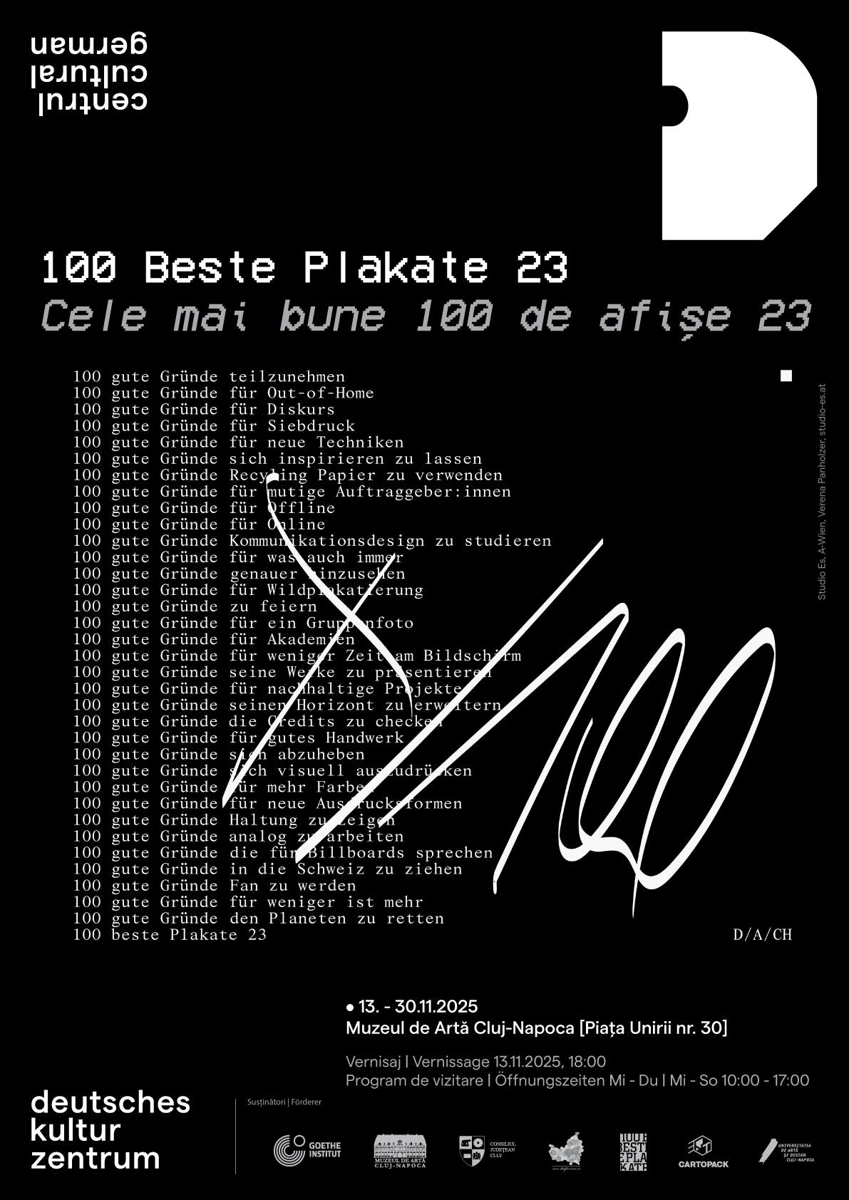 Centrul Cultural German din Cluj-Napoca, în parteneriat cu Asociația 100 beste Plakate eV și Muzeul de Artă Cluj-Napoca, cu susținerea Goethe-Institut București, Cartopack și Universitatea de Artă și Design din Cluj-Napoca, organizează, în perioada 13 – 29 noiembrie 2025, expoziția „100 Beste Plakate 23 // Cele mai bune 100 de afișe 23”.