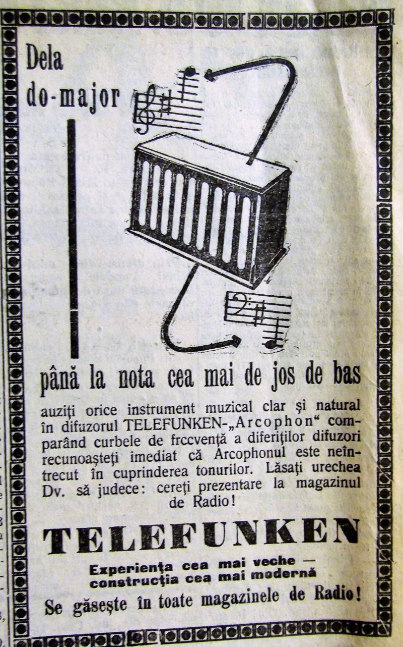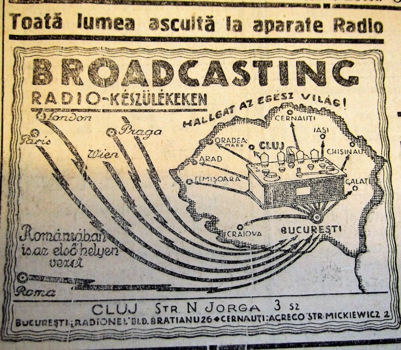 „Un lucru ce n-a avut încă Clujul: Un salon de Radio, – acum îl va avea şi oraşul nostru. Magazine de Radio sunt destule, dar un salon de Radio, cum sunt cele din Paris, Berlin, Viena, care sunt în acelaşi timp şi expoziţii de aparate de Radio, dintre cele mai moderne, dintre cele mai fine, dintre cele mai frumoase, acele saloane sunt şi săli de audiţie, de concerte, – un astfel de salon s-a deschis şi la Cluj, în Piaţa Unirii nr.4 (în curte) lângă Farmacia Biro.