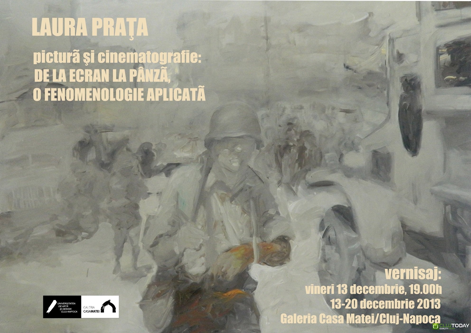 Expoziţia ”Pictură şi Cinematografie: De la ecran la pânză, o fenomenologie aplicată”, semnată de tânăra artistă Laura Praţa, doctorand în ultimul an la Universitatea de Artă şi Design din Cluj-Napoca se va deschide vineri. Vernisajul va avea loc în 13 decembrie de la ora 19, în Galeria Casa Matei. Manifestarea va avea loc până în 20 decembrie și încheie anul expozițional la Galeria Casa Matei.Proiectul Laurei Praţa, care se constituie şi în subiectul tezei sale de doctorat, realizează o trecere în revistă a elementelor care intersectează cele două arte din punctul de vedere al paradoxului fenomenologic, dar şi o analiză a direcţiilor şi reperelor cinematografice care ar putea influenţa pictura contemporană.