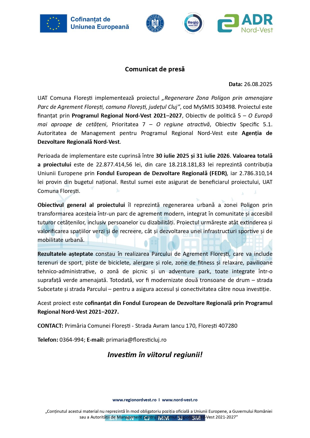 Proiectul „Regenerare Zona Poligon prin amenajare Parc de Agrement Florești” este cofinanțat din Fondul European de Dezvoltare Regională (FEDR), prin Programul Regional Nord-Vest 2021–2027.
