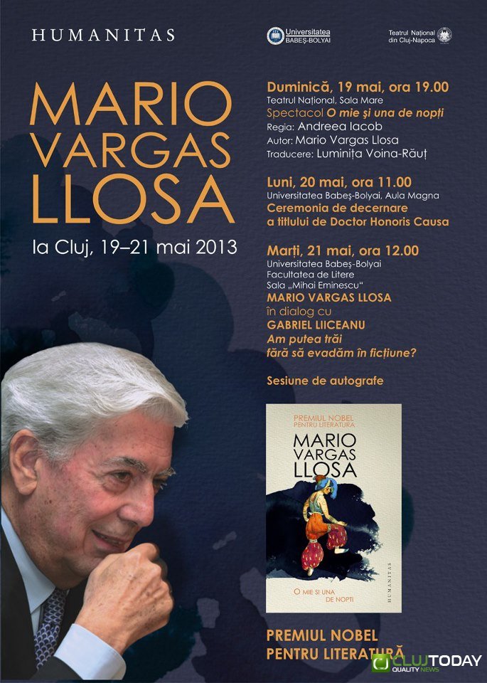 Celebrul scriitor sud-american Mario Vargas Llosa, laureat al premiului Nobel pentru literatura, va fi prezent la Cluj, incepand cu data de 19 mai, pentru o serie de evenimente culturale, si nu numai. In seara zilei de duminica, 19 mai, mai precis de la ora 19h00, pe scena Teatrului National din Cluj va avea loc premiera spectacolului „O mie si una de nopti”, o punere in scena semnata de regizoarea clujeana Andreea Iacob, dupa textul romanului omonim al lui Maro Vargas Llosa, de altfel prezent printre spectatorii clujeni prezenti la aceasta reprezentatie artistica.In urmatoarea zi, luni, 20 mai, in Aula Magna a Universitatii Babes-Bolyai, de la ora 11h00, va avea loc decernarea titlului de doctor honoris causa lui Mario Vargas Llosa, in cadrul unei ceremonii festive a Senatului acestei universitati clujene. Marti, 21 mai, in sala „Mihai Eminescu” a Facultatii de Filologie a Universitatii Babes-Bolyai, va avea loc loc un dialog intre scriitorii Mario Vargas Llosa si Gabriel Liiceanu pe marginea intrebarii: „Am putea trai fara sa evadam in fictiune?”, discutii urmate de o sesiune de autografe.