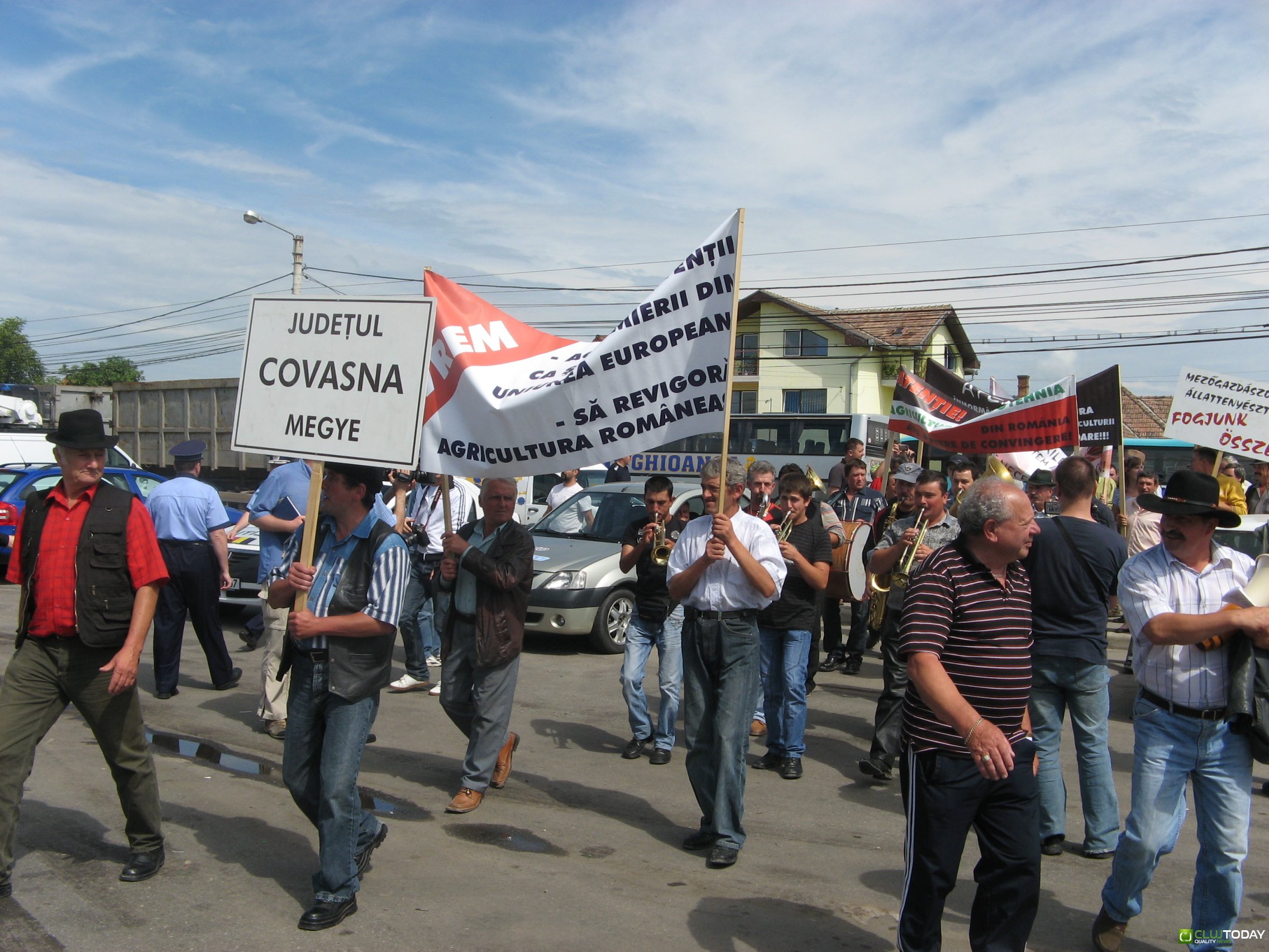 Aproximativ 2.000 de fermieri au ieşit azi în stradă la Cluj, ca să protesteze împotriva faptului că Guvernul nu le-a plătit subvenţiile crescătorilor de bovine. Protestul fermierilor a paralizat traficul rutier.Fermierii s-au adunat din toate judeţele din Transilvania, Maramureş şi Crişana. Unii au venit din Banat şi din Moldova. Oamenii au adus cu ei tălăngi, fluiere şi biciuri. Delegaţia fermierilor din judeţul Covasna a venit cu o fanfară. Orchestra fermierilor secui a interpretat melodii populare, dar şi „Deşteaptă-te, române!” în semn de solidaritate cu fermierii de etnie română. Oamenii s-au adunat pe strada Plevnei, de unde au pornit pe jos, în marş, spre centrul oraşului. Ei au ajuns la Prefectură, unde au fost câteva incidente, în momentul în care unii dintre fermieri au încercat să forţeze cordonul jandarmilor care protejează instituţia publică. „Noi nu cerem locuri de muncă, noi avem locuri de muncă. Vrem doar să ne deie subvenţiile, ca să ne putem plăti ratele cătră bănci”, a spus o femeie care a participat la protest.