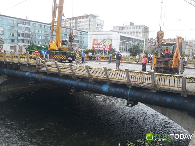 O bucată din podul Traian s-a surpat. Macaralele au intervenit şi au ridicat placa ruptă