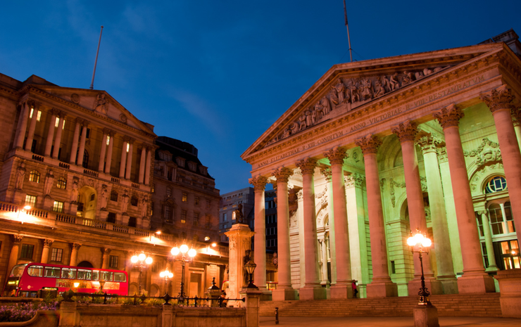 În 1734, Banca Angliei s-a mutat în actualul său sediu, care a fost reconstruit parţial în secolul XX. De asemenea, Banca Angliei a primit dreptul să emită monede şi bancnote. Ca o curiozitate, în prezent, Banca Angliei are dreptul exclusiv de a emite bani pentru Anglia şi Ţara Galilor, însă în Regatul Unit există opt bănci care au acest drept, inclusiv bănci private din Scoţia şi Irlanda de Nord; aceste emisii de bani trebuie, evident, să respecte reguli stricte, fixate de Banca Angliei.