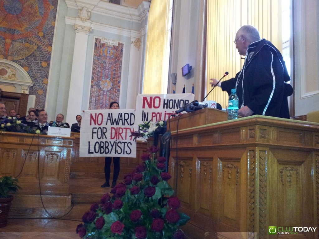 Un protest organizat de mai mulți tineri a perturbat ceremonia organizată în Aula Magna a Universității Babeș-Bolyai pentru decernarea titlului de Doctor Honoris Causa pentru fostul comisar european pentru extindere, Gunther Verheugen. Prin intermediul unor bannere, tinerii au spus că nu sunt de acord cu acordarea pe criterii politice a unor titluri universitare.