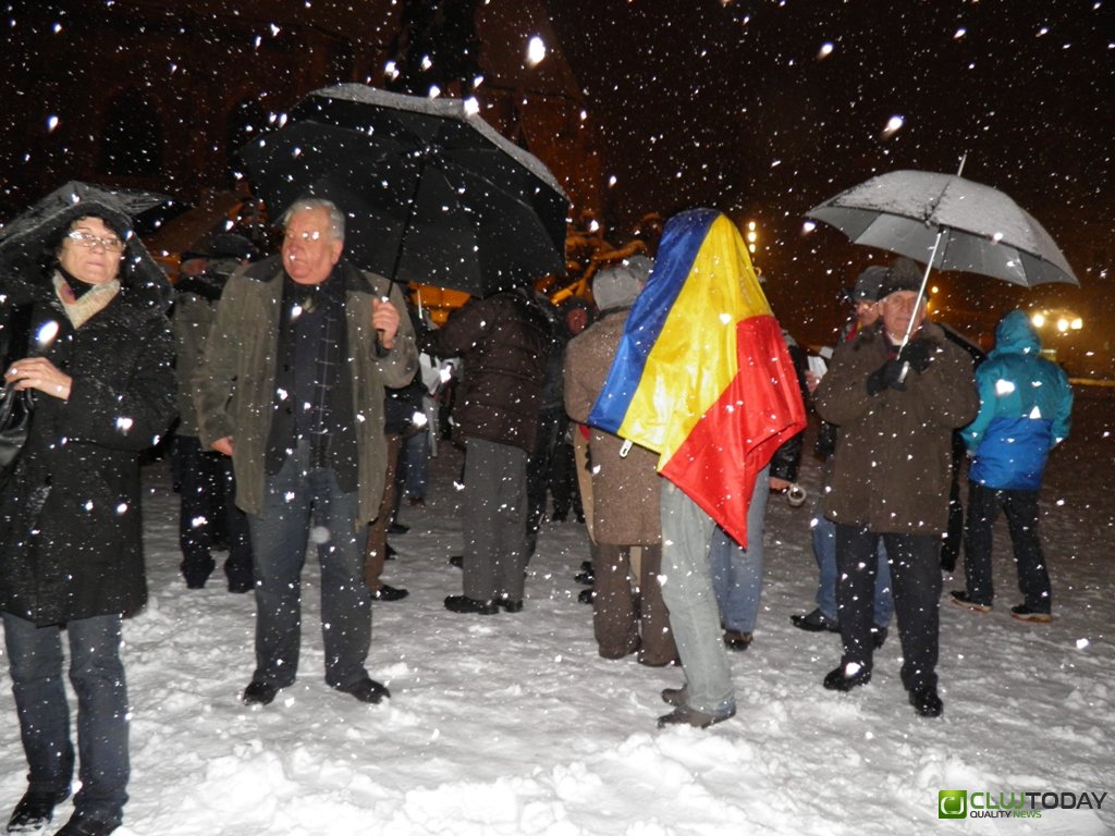 Ninsoarea care cade din abundență la Cluj și nămeții care au cotropit Clujul nu i-au descurajat pe protestatari să se adune din nou în Piața Unirii. Circa 100 de persoane spun că vor continua să protesteze până când va demisiona președintele Traian Băsescu.