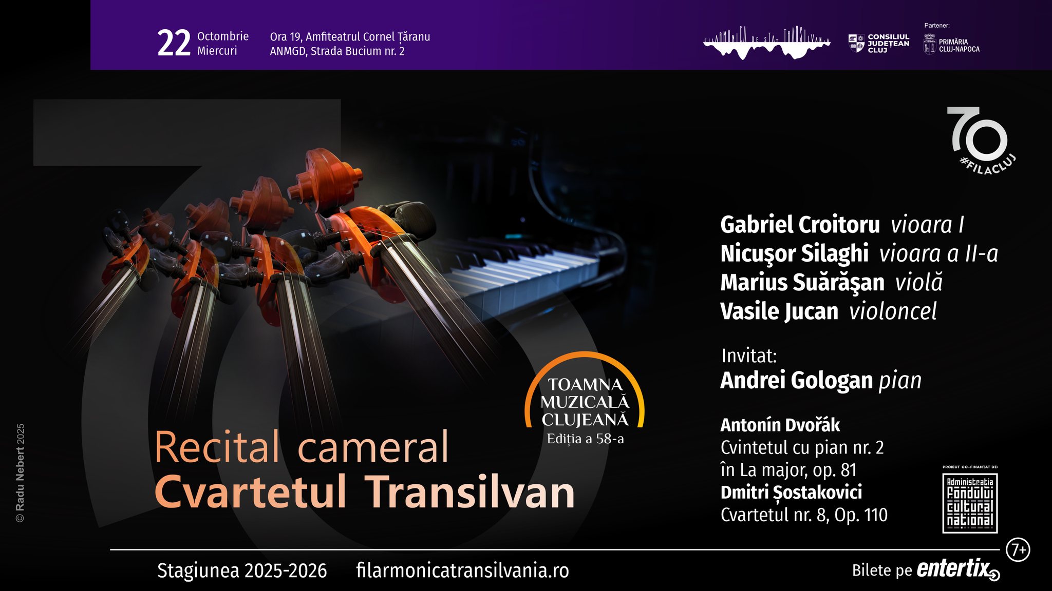 Miercuri, 22 octombrie 2025, de la ora 19:00, Amfiteatrul Cornel Țăranu al Academiei Naționale de Muzică „Gheorghe Dima”, de pe strada Bucium nr. 2, își va deschide porțile pentru a găzdui un recital cameral al Cvartetului Transilvan (Gabriel Croitoru – vioara I, Nicuşor Silaghi – vioara a II-a, Marius Suărăşan – violă și Vasile Jucan – violoncel) alături de Andrei Gologan (pian).