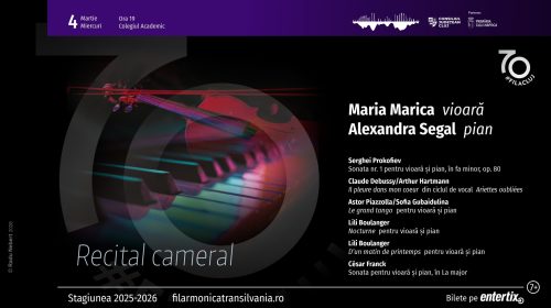 Stagiunea aniversară a Filarmonicii clujene la 70 de ani continuă în această săptămână cu o serie de evenimente prin intermediul cărora va fi celebrată femeia, frumusețea și delicatețea acesteia. Astfel, Maria Marica și Alexandra Segal vor urca pe scena sălii Auditorium Maximum, miercuri, 4 martie 2026, începând cu ora 19:00. Pasionații de muzică sunt așteptați, așadar, la Colegiul Academic, pentru un recital cameral din programul căruia vor face parte lucrări semnate de Serghei Prokofiev, Claude Debussy/Arthur Hartmann, Astor Piazzolla/Sofia Gubaidulina, Lili Boulanger și César Franck. SportinCluj.ro: Bătaie generală la meciul … Continuă lectura Recital cameral care celebrează femeia, la Colegiul Academic