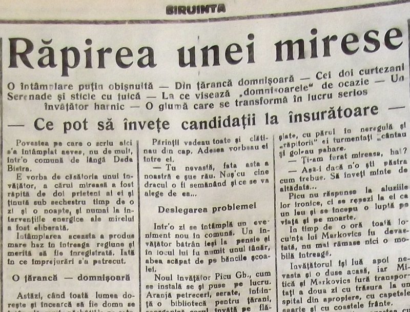 E vorba de căsătoria unui învăţător, a cărui mireasă a fost răpită de doi prieteni ai ei şi ţinută sub sechestru timp de o zi şi o noapte, şi numai la intervenţiile energice ale mirelui a fost eliberată.