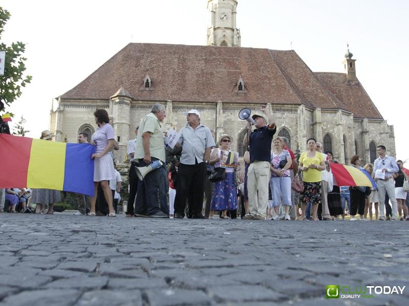 Protestatarii au scandat “CCR în România, ne învaţă ce-i hoţia”, “Noi am votat, voi ne-aţi furat” sau “Boc, Boc, Boc, nu te-am uitat deloc”.Aproximativ 60 de oameni au protestat aseară în Piaţa Unirii împotriva revenirii lui Traian Băsescu la Cotroceni. În marea lor majoritate erau vârtsnici şi au mai participat la acţiuni similare şi în timpul iernii. Între scandări se află „Ruşine să vă fie”, „Boc, Boc, Boc, nu te-am uitat deloc”, „CCR în România, ne învaţă ce-i hoţia”, „Demisia”, „Noi am votat, voi ne-aţi furat”, „Ieşi afară, javră ordinară”, „Băsescu, nu uita, asta nu e ţara ta” sau „Clujeni, treziţi-vă!”.
