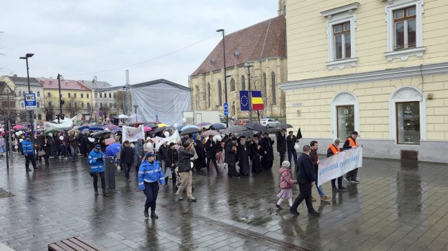 În ciuda vremii ploioase, sute de clujeni au participat sâmbătă, 28 martie 2026, în Piața Unirii, la Marșul „Împreună pentru viață”, un eveniment organizat anual în mai multe orașe din țară, dedicat susținerii vieții și solidarității față de femeile însărcinate aflate în dificultate.
