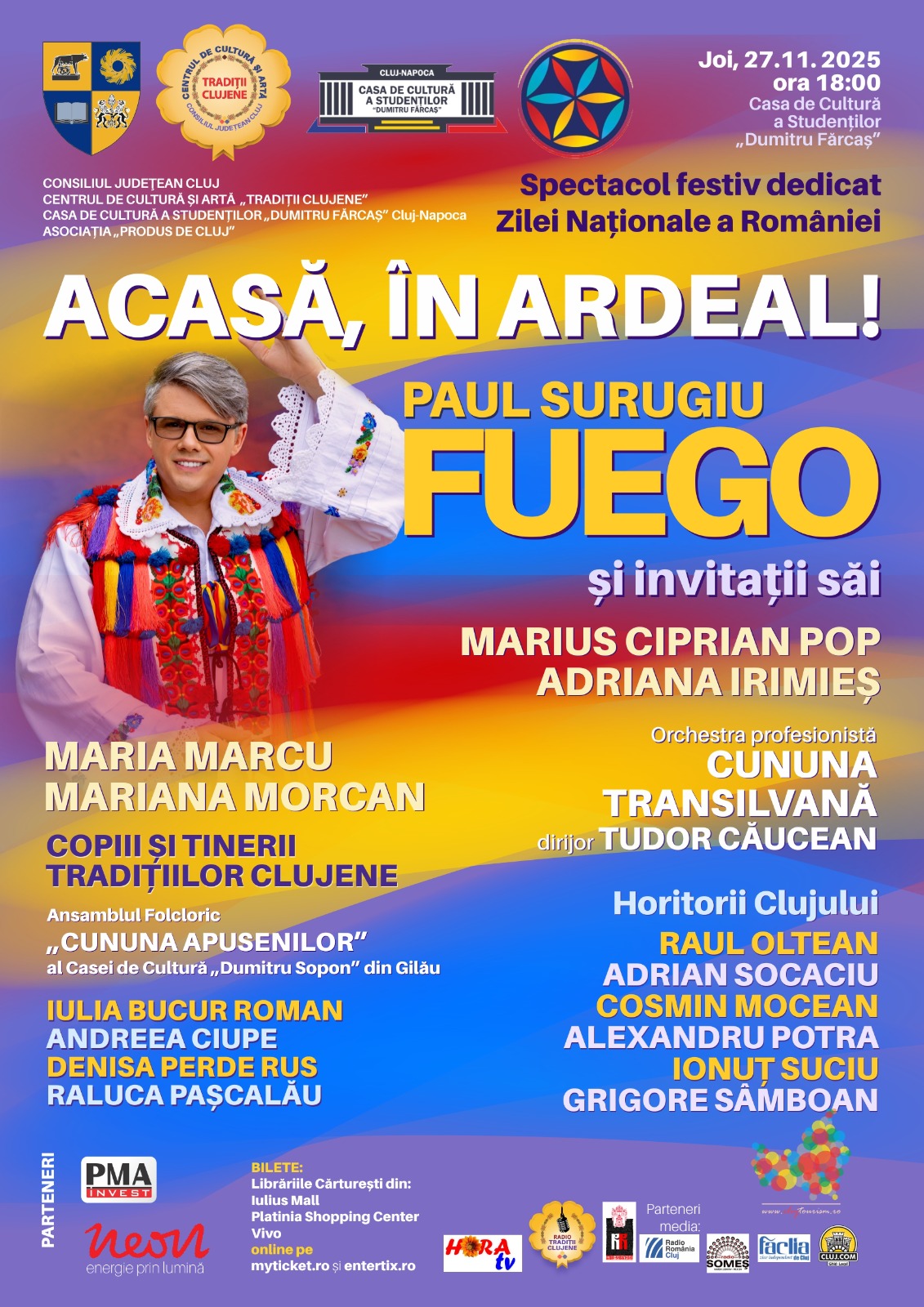 Cu prilejul Zilei Naționale a României, publicul clujean este invitat la spectacolul „Acasă, în Ardeal!”, susținut de Paul Surugiu-Fuego și invitații săi, care va avea loc joi, 27 noiembrie 2025, de la ora 18:00, la Casa de Cultură a Studenților „Dumitru Fărcaș” din Cluj-Napoca. Evenimentul se înscrie în seria manifestărilor dedicate celebrării identității naționale și reunește artiști de prestigiu ai muzicii populare românești, acompaniați de Orchestra Profesionistă „Cununa Transilvană”, dirijor Tudor Căucean. Alături de Fuego, vor urca pe scenă: Maria Marcu, Marius Ciprian Pop, Adriana Irimieș și Mariana Morcan. Programul…
