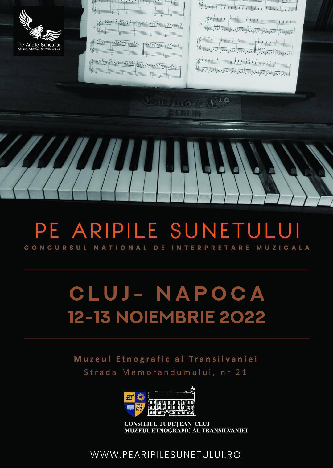 Muzeul Etnografic al Transilvaniei va găzdui în perioada 12-13 noiembrie 2022, cea de-a XI ediție a Concursului Național de Interpretare muzicală „Pe Aripile Sunetului”. Evenimentul este organizat de echipa ,,Pe Aripile Sunetului” și se va desfășura în format fizic, în perioada amintită, în incinta Muzeului Etnografic al Transilvaniei, strada Memorandumului nr. 21, Cluj- Napoca. Mai multe detalii despre înscriere și regulament pot fi găsite pe site-ul organizatorilor: www.pearipilesunetului.ro.
