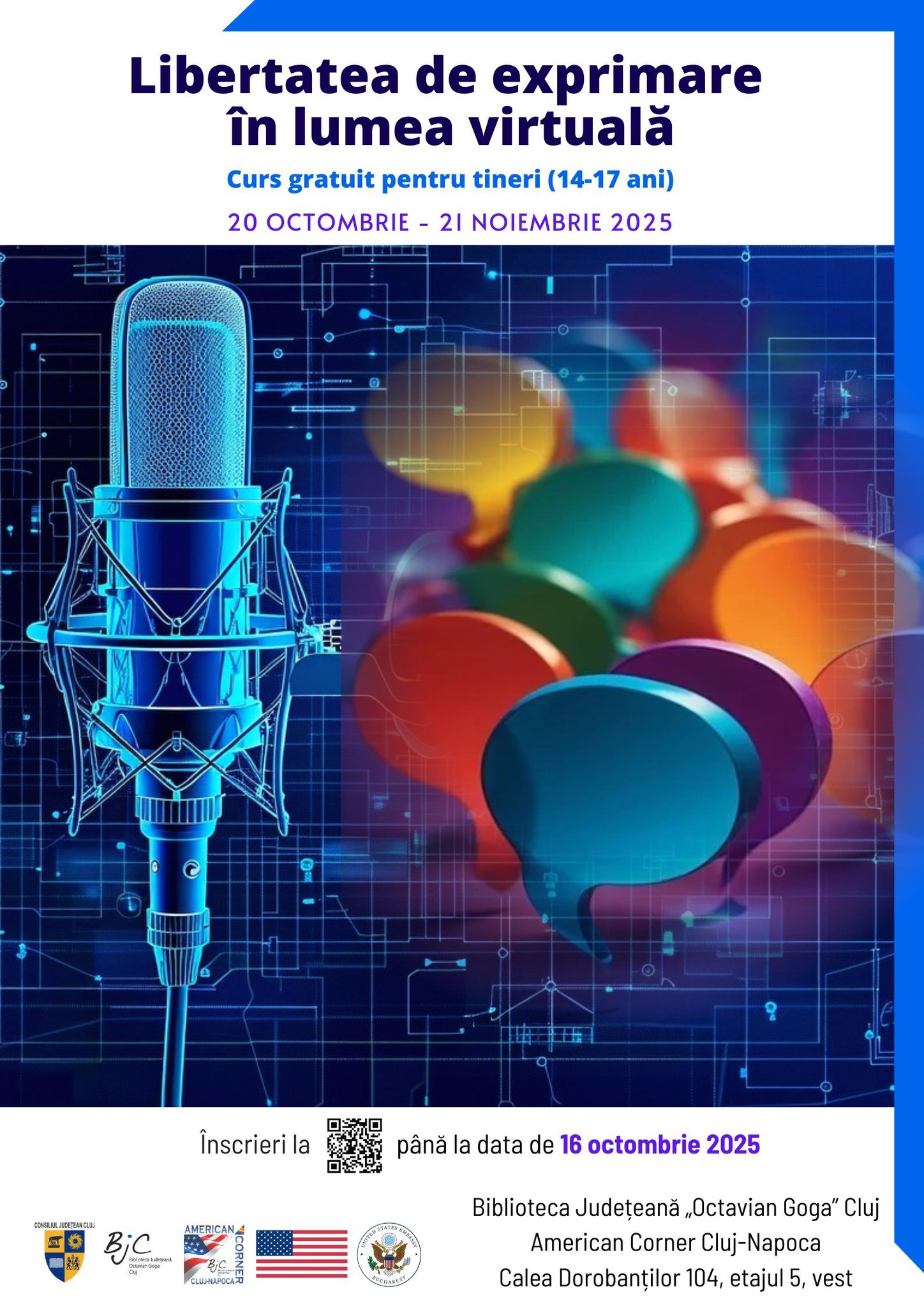 Biblioteca Judeţeană „Octavian Goga” Cluj organizează la American Corner Cluj-Napoca, în perioada 20 octombrie – 21 noiembrie 2025 cursul gratuit „Libertatea de exprimare în lumea virtuală”. Cursul este adresat tinerilor între 14 și 17 ani. Finanțat de Ambasada Statelor Unite ale Americii în România, acesta urmărește îmbunătățirea modului în care tinerii între 14 și 17 ani evaluează informațiile, în special informațiile comunicate în mediul virtual, și dezvoltarea gândirii critice. Participanții vor primi o diplomă la încheierea programului de instruire, în urma realizării unei prezentări referitoare la tema cursului și a…