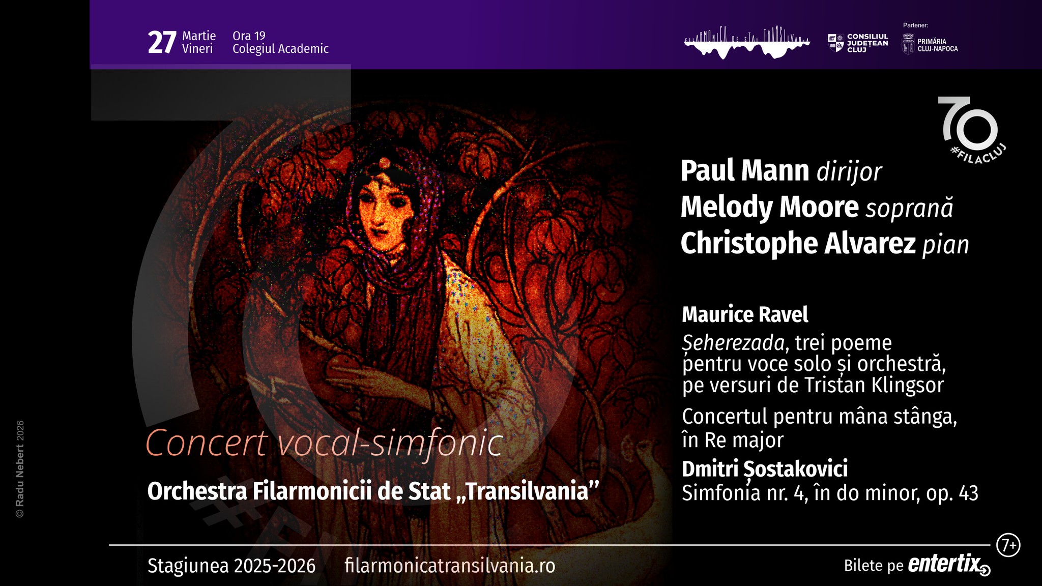 Ultimul concert al lunii martie îi readuce pe scena Filarmonicii clujene pe soprana Melody Moore și pe pianistul Christophe Alvarez sub bagheta dirijorului Paul Mann. Concertul va avea loc la Colegiul Academic, vineri, 27 martie 2026, ora 19:00, iar programul serii va conține lucrări semnate de Ravel și de Șostakovici. Biletele online la concert se pot achiziționa de pe site-urile entertix.ro și myticket.ro. Biletele se pot cumpăra și de la Agenția de Bilete a Filarmonicii (Piața Lucian Blaga nr. 1-3, tel. 0756-048.318 sau 0264-430.060) sau cu o oră înainte de…