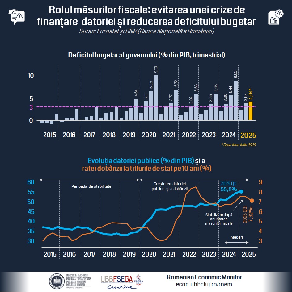 Măsurile de austeritate anunțate recent de Guvern reprezintă o povară pentru populație și au generat valuri de proteste. Totuși, scenariul alternativ, pe care România l-a evitat tocmai prin luarea acestor decizii, ar fi fost o criză majoră de finanțare a datoriei publice, consideră specialiștii Romanian Economic Monitor (RoEM) UBB-FSEGA, proiect de cercetare al Facultății de Științe Economice și Gestiunea Afacerilor (FSEGA) din cadrul Universității Babeș-Bolyai (UBB) din Cluj-Napoca. „O criză de finanțare a datoriei publice ar fi dus la pierderea încrederii creditorilor externi în capacitatea sau disponibilitatea guvernului de a-și…