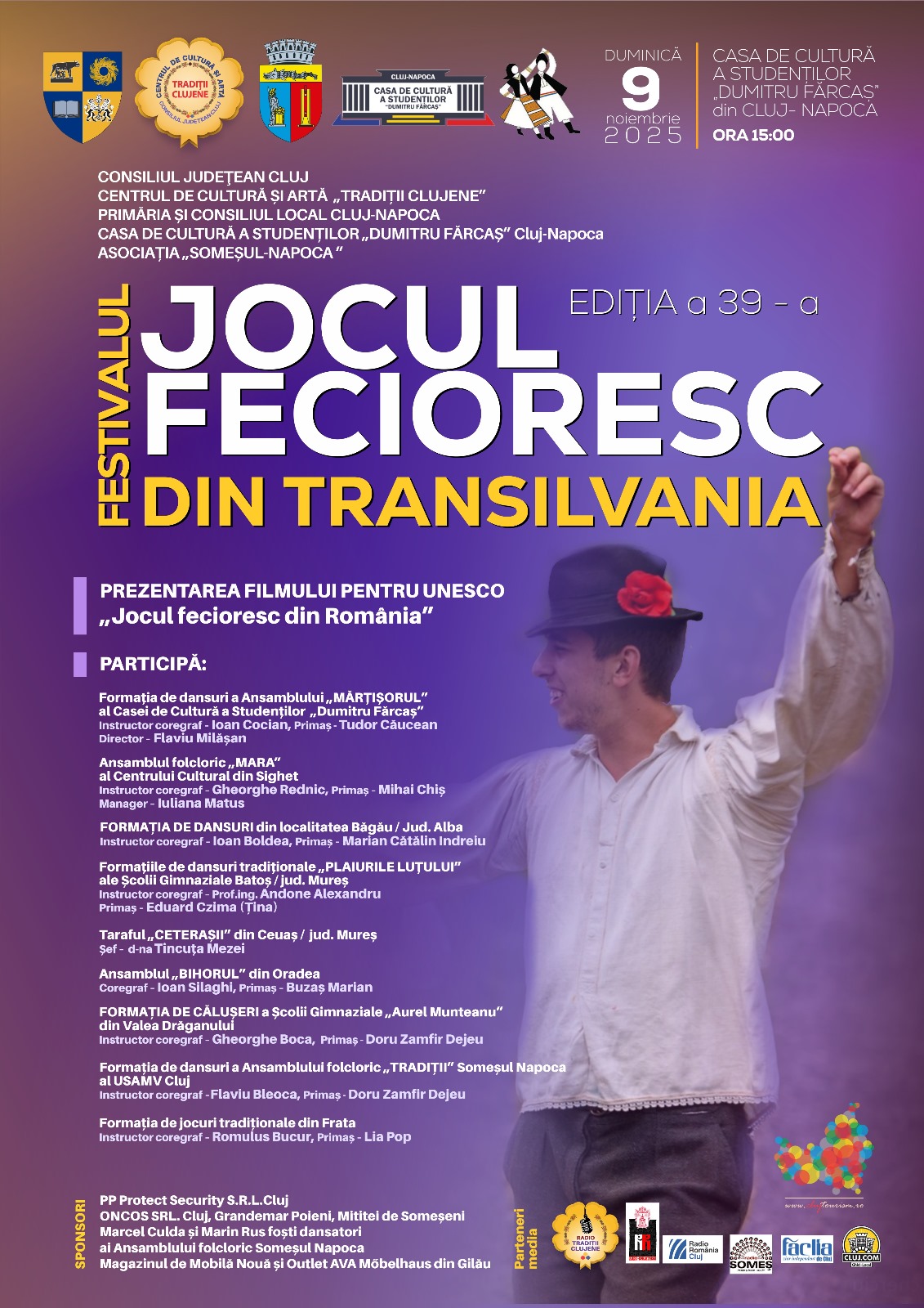 A 39-a ediție a Festivalului Jocul fecioresc din Transilvania va avea loc duminică, 9 noiembrie, de la ora 15:00 la Casa de Cultură a Studenților din Cluj-Napoca. Evenimentul este organizat de către Asociaţia Folclorică „Someşul-Napoca”, Casa de Cultură a Studenților „Dumitru Fărcaș”, în parteneriat cu Centrul de Cultură și Artă „Tradiții Clujene”. Festivalul, finanțat de Primăria și Consiliul Local Cluj-Napoca și de Consiliul Județean Cluj, are ca scop promovarea și valorizarea patrimoniului cultural imaterial. „Jocul Fecioresc din Transilvania” a fost înscris, în anul 2015, în Patrimoniul Cultural Imaterial al Umanității…