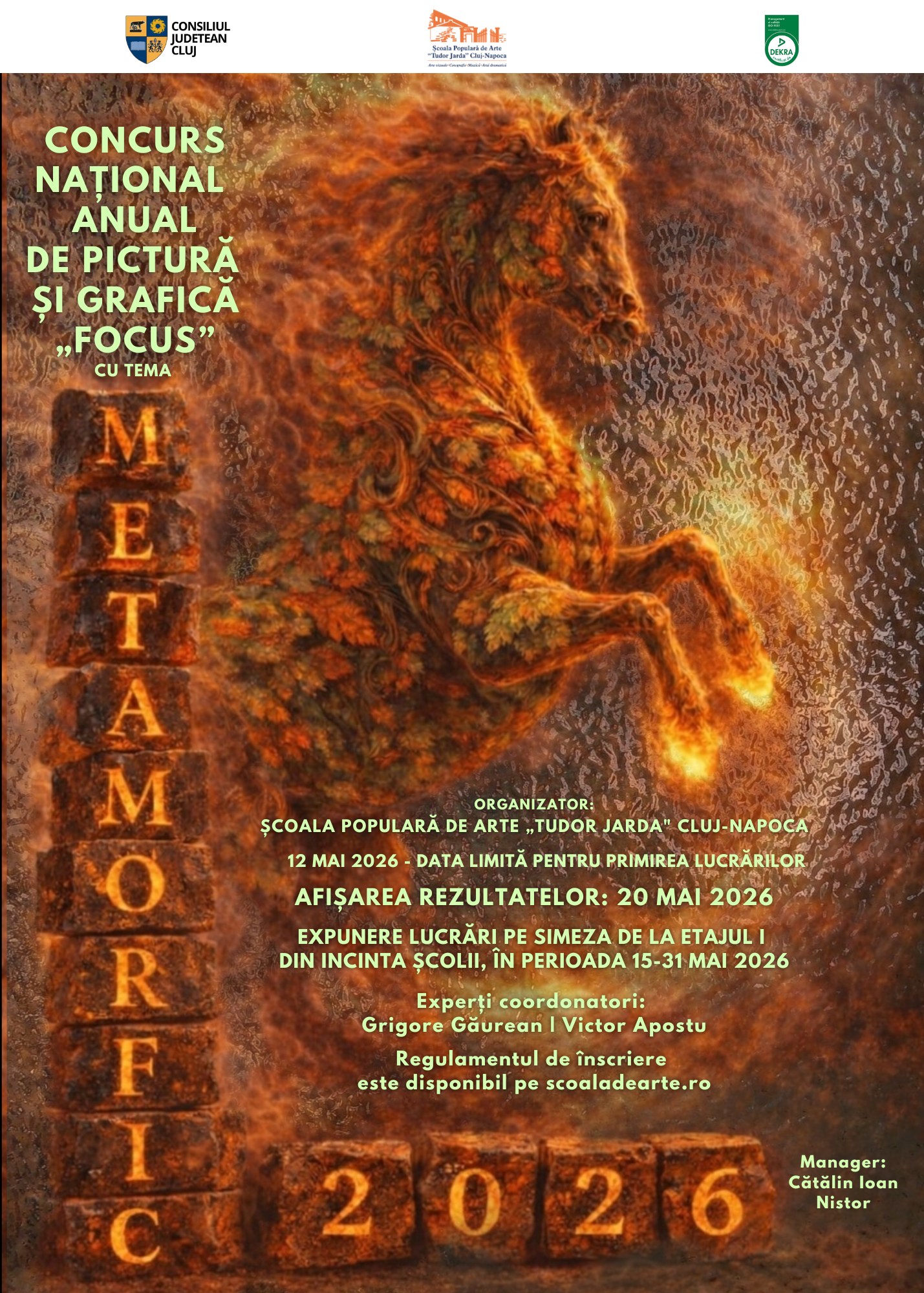 Cea de-a XVII-a ediție a concursului național de pictură și grafică „FOCUS”, organizat de către Școala Populară de Arte „Tudor Jarda” Cluj-Napoca, va avea loc în perioada 15 – 31 mai 2026. Evenimentul, devenit o tradiție în peisajul artistic românesc, oferă tinerilor artiști oportunitatea de a-și exprima viziunea creativă și de a se afirma în domeniul artelor plastice. Tema ediției din acest an, „METAMORFIC 2026”, invită participanții să exploreze transformarea ca proces continuu, prin lucrări în care formele se nasc, se destramă și se reconfigurează. Sunt încurajate compozițiile dinamice, cu…