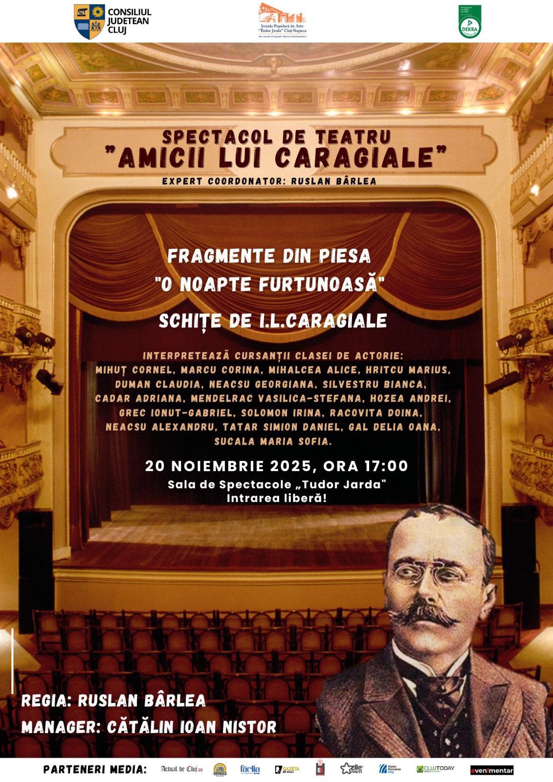 Școala Populară de Arte „Tudor Jarda” Cluj-Napoca organizează un eveniment de excepție în cadrul programului cultural al instituției. Joi, 20 noiembrie 2025, începând cu ora 17:00, sala de spectacole a școlii va găzdui evenimentul „Amicii lui Caragiale”, un spectacol de teatru realizat de cursanții clasei de actorie, sub coordonarea și regia expertului Ruslan Bârlea. Evenimentul aduce în prim-plan fragmente din celebra piesă „O noapte furtunoasă”, precum și o serie de schițe semnate de I. L. Caragiale, reinterpretate cu talent, umor și sensibilitate de cursanții școlii. Sub îndrumarea carismaticului Ruslan Bârlea,…