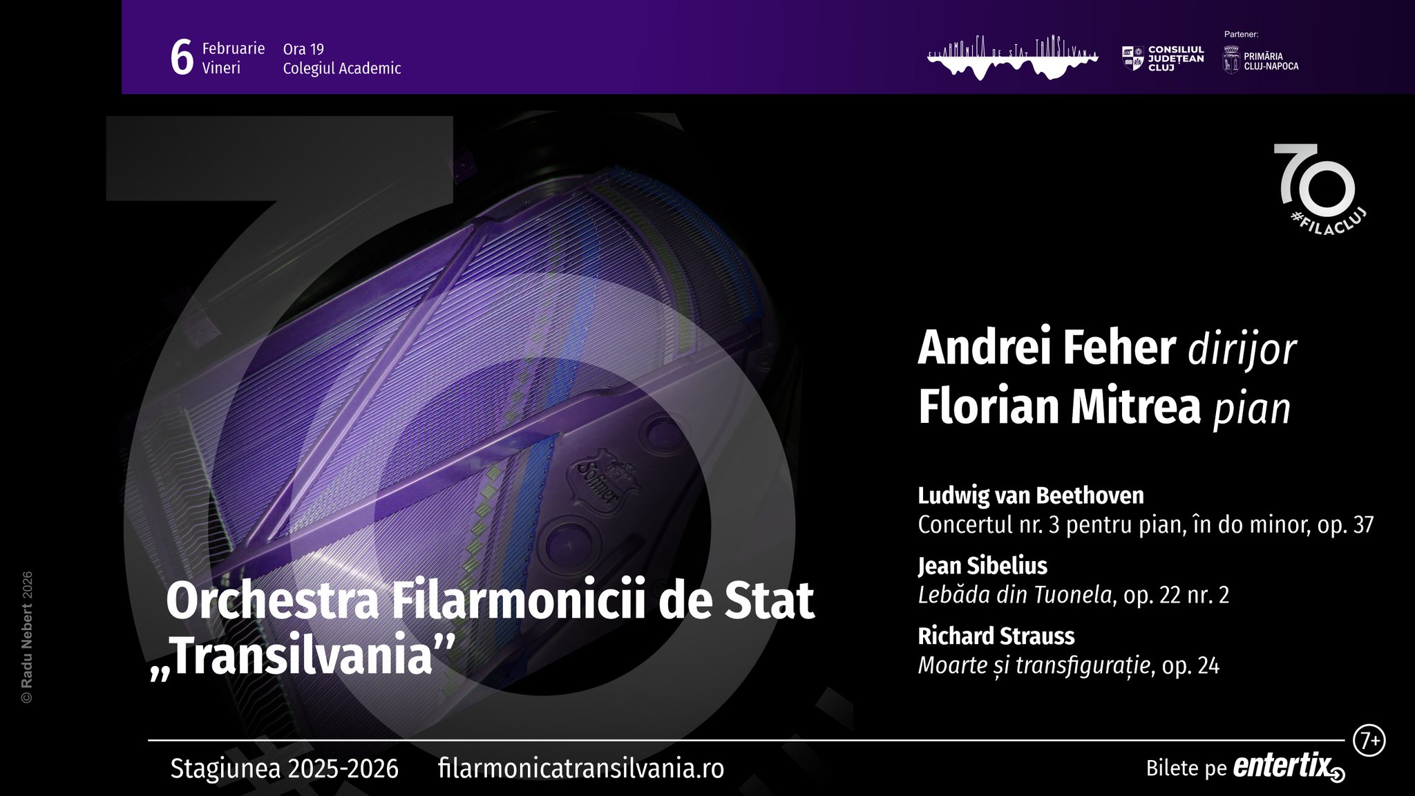 Concertul simfonic din programul căruia vor face parte lucrări semnate de Ludwig van Beethoven (Concertul nr. 3 pentru pian, în do minor, op. 37), Jean Sibelius (Lebăda din Tuonela, op. 22, nr. 22) și Richard Strauss (Moarte și transfigurație, op. 24) va avea loc vineri, 6 februarie 2026, de la ora 19:00, la Colegiul Academic.
