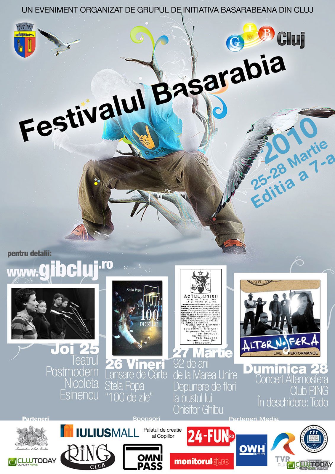 Grupul de Iniţiativă Basarabeană derulează cea de-a VII-a ediţie a Festivalului Basarabia în perioada 25-28 martie cu scopul de a sărbători 92 de ani de la Unirea Basarabiei cu România (27 martie 1918).Joi, 25 martie, ora 13.00 în Sala mică a Primăriei Cluj va avea loc deschiderea oficială a Festivalului, urmată de o dezbatere pe tema “ Gardul de sârmă ghimpată de pe Prut”.